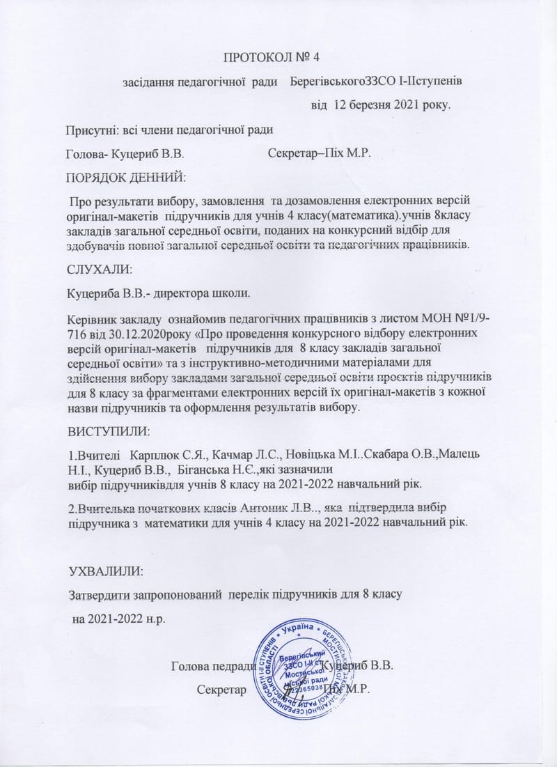 У Берегівському ЗЗСО І-ІІ ступенів відбулися загальні збори трудового колективу та звіт директора, Куцериба Валерія Васильовича, щодо своєї діяльності та роботи освітнього закладу в 2023/2024 навчальному році перед колективом, представниками громадськості та батьківського комітету. У заході взяла участь Мостиський міський голова Мирослава Пельц, начальниця відділу ОМС Надія Гнатовська, священник Володимир Олинець, староста Берегівського старостинського округу Орися Паськович, директори закладів освіти Мостиської громади. Звіт був поділений на окремі підрозділи в яких було висвітлено візитну картку закладу, якісний показник навченості здобувачів освіти, відомості про діяльність педагогів, внутрішню систему оцінювання якості освіти, систему оцінювання навчальних досягнень учнів, відомості щодо матеріально-технічної бази, організацію харчування та збереження здоров’я, національно-патріотичне виховання, гурткову та позакласну роботу, планування та стратегію розвитку Берегівського ЗЗСО І-ІІ ступенів. Під час звіту всі присутні змогли пригадати шкільні події та успішні проекти, що відбувалися впродовж навчального року, а це традиційні шкільні заходи і свята, заходи патріотичного виховання, правовиховна робота, школа здорового способу життя, волонтерська робота шкільного колективу, учнівське самоврядування, співпраця з вищими навчальними закладами, різноманітні майстер-класи, тренінги, семінари, конференції для вчителів та учнів, міжнародна співпраця, наші мандрівки, подорожі, екскурсії, робота з обдарованими учнями, наші досягнення та зміцнення матеріально-технічної бази школи. Мирослава Пельц подякувала директору та всьому колективу Берегівського ЗЗСО І-ІІ ступенів за наполегливу роботу та побажала мирного неба нашим дітям, а Надія Гнатовська зазначила, що головним залишається те, щоб ми досягли перемоги на війні та настав мир у нашій державі. Всі присутні одноголосно визнали діяльність керівника закладу освіти задовільною та побажали продовжувати працювати на благо наших дітей. Повний звіт та кошторис опубліковано на офіційному сайті Берегівського ЗЗСО І-ІІ ступенів.